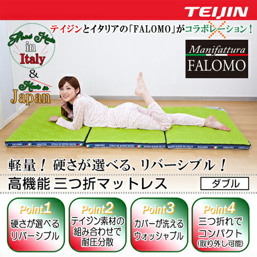 ■商品名 FALOMO 軽量!三つ折りマットレス ■カラー 表:グリーン、裏:ホワイト ■製品サイズ ダブル 137cm×200cm ■重量 3.7kg ■材質 【カバー部分】表綿:ポリエステル100%(3Dニット)、側面:ポリエステル100%、裏面:ポリエステル50%・レーヨン49%・ポリウレタン1%、詰め物:ポリエステル100%(elk® & SOLOTEX®)、約0.6kg 【中芯部分】詰め物:ポリエステル100%(V-Lap®)、約2.1kg ■帝人素材 中綿:帝人のV-Lap® elk® & SOLOTEX® ■製造元 帝人株式会社 ■生産国 カバー:イタリア製 中芯材:日本製