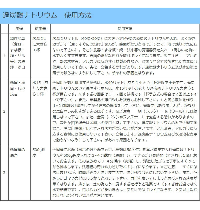 【使用量の目安】洗濯…水15Lあたり大さじ1杯、漂白…湯2Lあたり大さじ1杯、洗濯槽の洗浄…湯50Lあたり500g【使用上の注意】・括弧内の材質には使用できません(アルミ・一部の木材・漆塗り・金で装飾された物・絹・ウール・毛皮・皮革・真珠・その他アルカリに反応する材質)。