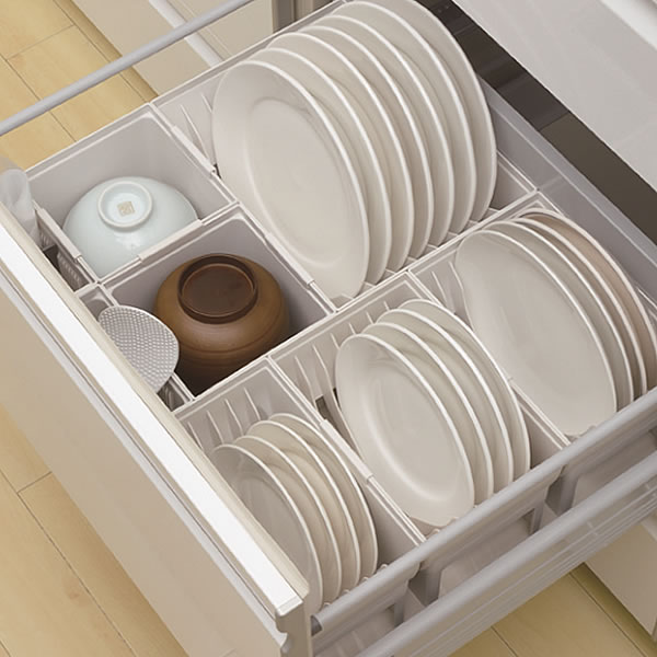 直径約18〜26cmの大きいお皿に対応して、付属のジョイントで複数のトトノシリーズを連結させて引き出しの中をしっかり仕切ってすっきり整頓する事ができます。